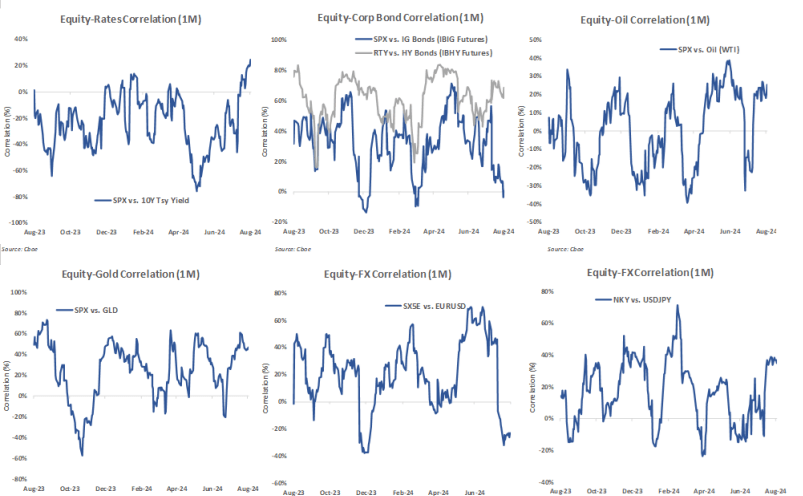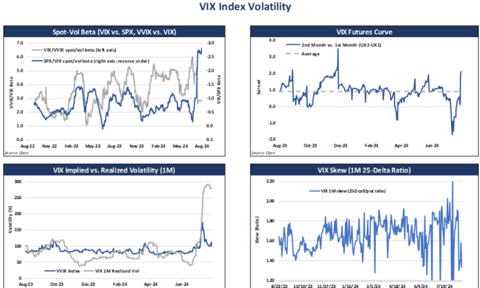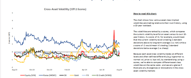 Cross-Asset Volatility: Cross-asset implied volatilities were mixed and mostly little changed following Jackson Hole as traders shifted away from inflation concerns towards the evolving “data-dependent” employment outlook to gauge the timing and pace of Fed rate cuts. The rates market was little surprised by Powell’s speech and accordingly, the probability for rate cuts going into year-end has remained relatively stable pre vs postconference while interest rate volatility declined slightly. (MOVE Index -3 nms to 105 bps vol.) The increased likelihood of US rate cuts, however, has continued to fuel an unease in the FX markets, causing FX vols to bounce back to 94th percentile highs as the USD continues to plummet to one-year lows against the major global currencies.