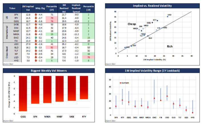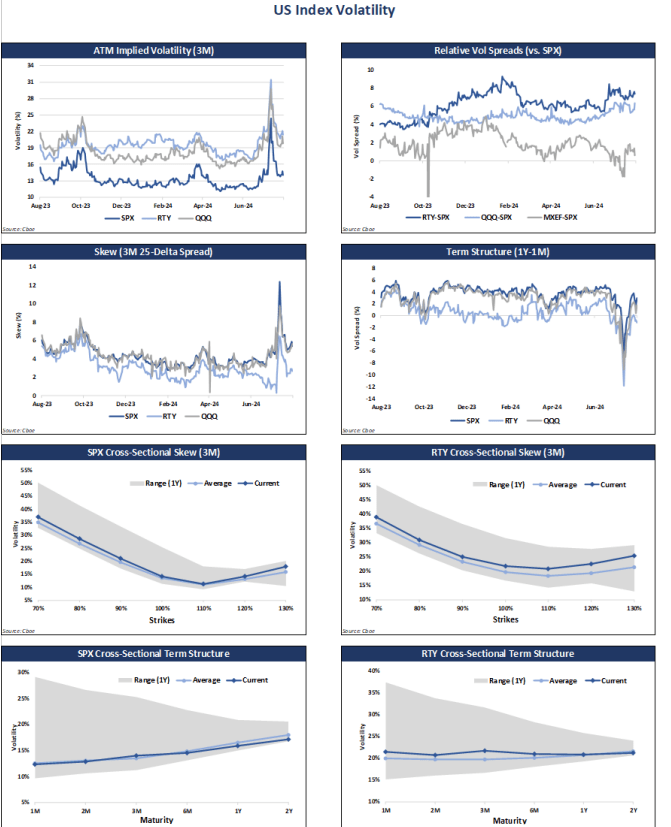 Skew: The net effect of the increased demand for convexity has been a 0.5% vol pt steepening in short-dated (1M, 25-delta) SPX skew. This steep skew (82nd percentile high) is in turn likely to stabilize vol of vol as we head into the long Labor Day weekend.
