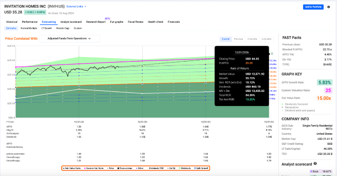 INVH’s share price (black line) remains below its historical average multiple (blue line) and in the event of multiple expansion via mean reversion, we’re looking at a stock that could generate annualized total returns north of 13% over the coming years. That would represent total returns of nearly 35% between now and the end of 2026.