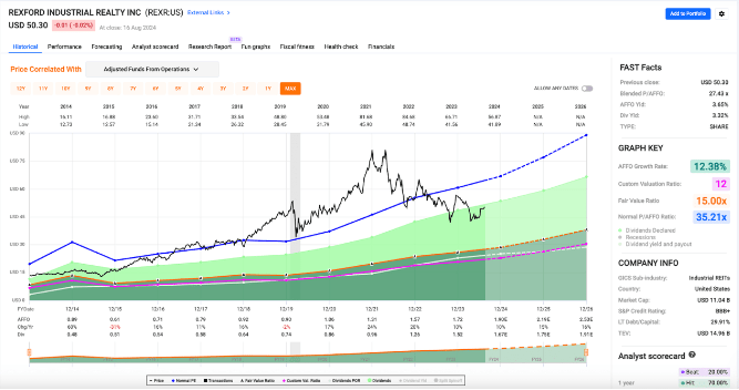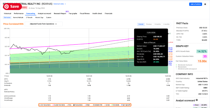 Looking at the FAST Graphs above, you’ll see that REXR’s sell-off since the highs in 2021 has driven its share price (black line) well below its long-term average P/AFFO (blue like). In the event of multiple expansion back up to that ~35x area (which appears to be justified, looking at forward AFFO growth prospects) we’re looking at a stock that could generate annualized returns of nearly 30% over the next 2.5 years. That’s a total return of ~85% between now and the end of 2026.