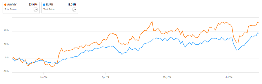 ABN AMRO (OTCPK:AAVMY) has outperformed the iShares MSCI Europe Financials ETF (EUFN) so far in 2024, delivering a total return of almost 26% against the circa 19% gain for the benchmark ETF: