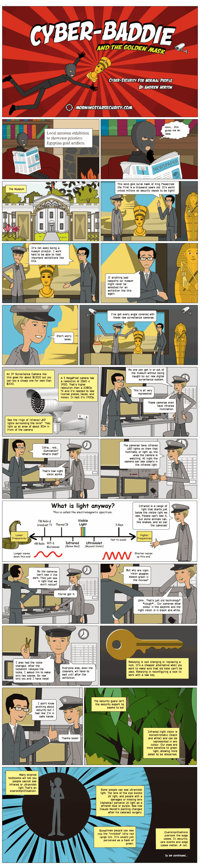 Episode one introduces our anti-hero and he immediately begins to plan a museum heist. The use of this well-trodden trope relies on associated concepts that make the story writing simpler, enabling me to focus on security education. This episode introduces the user to infrared light, as used for night vision. The concept of rekeying locks is also mentioned, but I am leaving a further explanation of how locks work for later.