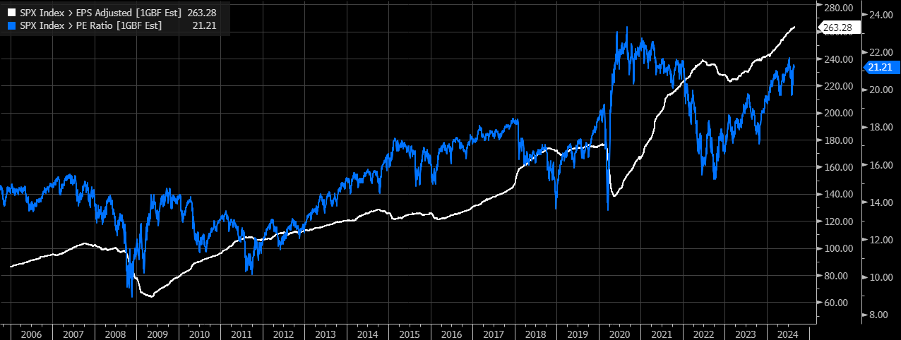 The expansion of the P/E ratio has driven the majority of the rally over the past 12 months. Since August 2023, the S&P 500’s P/E ratio has risen by 13.9% to 21.2 times its next twelve-month earnings estimates. Meanwhile, earnings are expected to grow by 11.3% over the next twelve months to $263.28 per share.