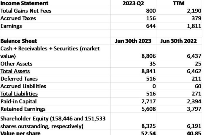 For the second quarter ended June 30th, 2023, KVF gained $4.07 per share, increasing the value of each share to $52.54. This represents a 10% pre-tax return, similar to the 8% S&P 500 return, slightly outperforming the 5% Russell 2000 return, and beating the S&P/TSX which barely broke even on the quarter. Currency losses hurt returns by $0.49 per share in the quarter.