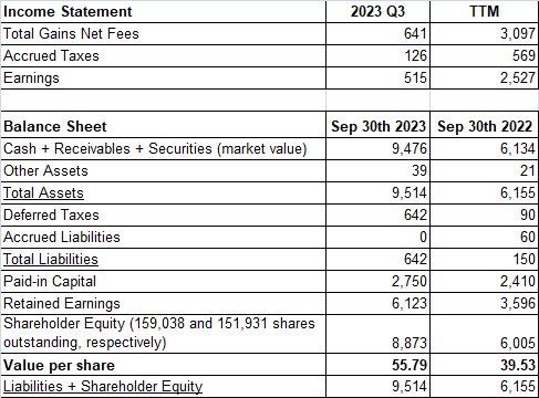 For the third quarter ended September 30th, 2023, KVF gained $3.25 per share, increasing the value of each share to $55.79. This represents a 8% pre-tax return, while the returns of the S&P 500, Russell 2000, and S&P/TSX were all negative on the quarter. In addition, currency losses hurt returns by $0.31 per share in the quarter.
