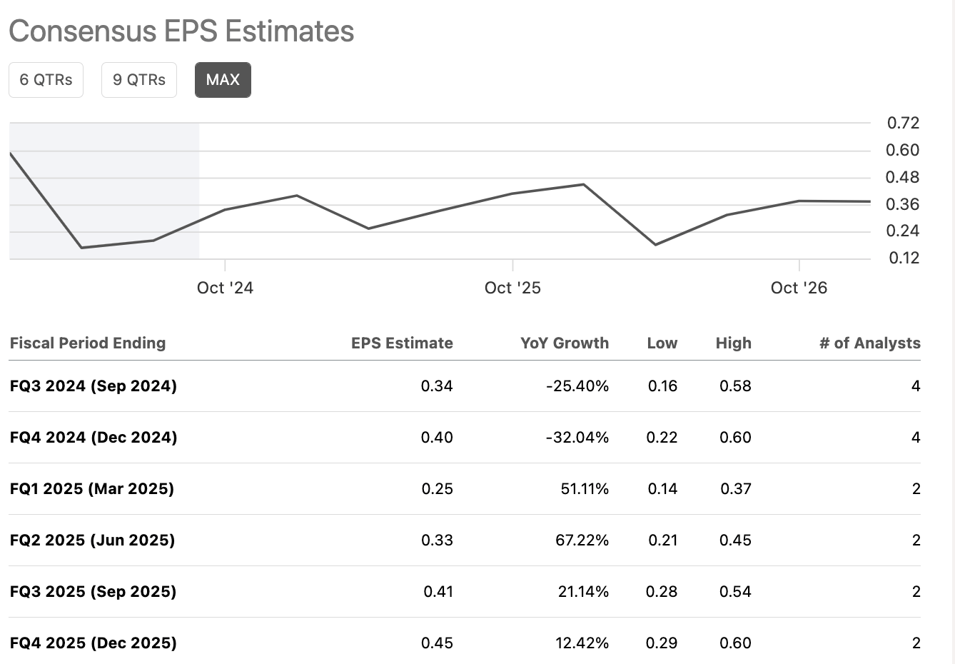 Consequently, in Q3 and Q4, even though analysts anticipate that the company’s revenues will increase, its EPS should decrease. Analysts did anticipate a new peak for its EPS in 2025, though. The worst case scenario, therefore, is that the stock price of the company will bottom in Q1 2025 and reach a record level in 2025, meaning a 145% upside. My DCF model estimates valuation to be $49.2 per share or a 160% upside. Because of this, the upside potential is considerably more alluring than it was when I first covered it.