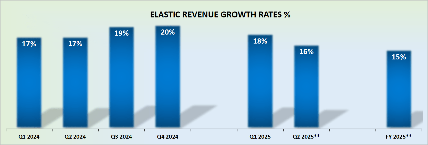 Elastic had previously guided to grow its topline by 16% y/y in fiscal 2025. Now, its guidance has been pulled in so that its topline will most likely grow by 15% y/y, or thereabouts.
