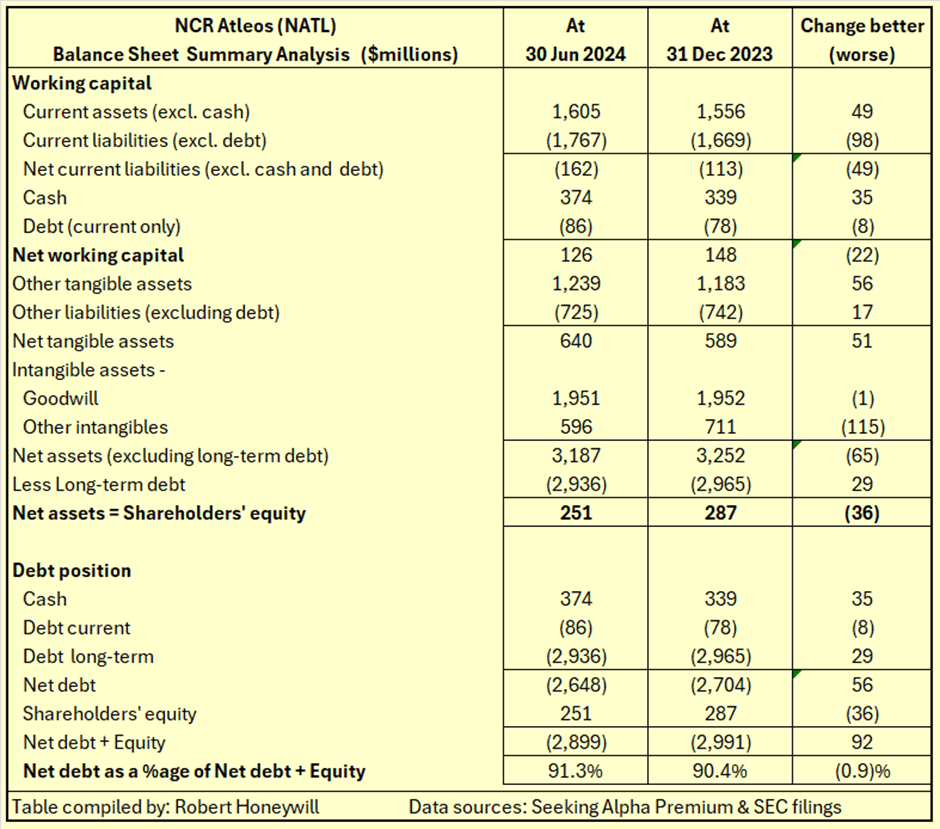 P/E Ratio on August 29, 2024 (based on H1-2024 EPS annualized) – Based on diluted non-GAAP (1) EPS of $0.91 for H1-2024 and the current share price of $28.97, the current P/E ratio is 15.89. This compares to the median P/E ratio of 11.94 for the NCR Atleos sector per SA Premium. Given minimal growth in operating earnings, per Table 1 above, and a weak balance sheet as described in Table 2 below, it is difficult to see why NCR Atleos should attract a P/E ratio in excess of the sector median. At a sector median of 11.94, the share price would reduce from $28.97 to $21.77.