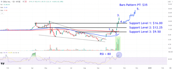 We can forecast a bullish price target by using a bars pattern, a technique that analyzes prior trends on the chart to project future moves. In this case, we’ll extract Oklo’s trending period from September to October and overlay that move from prior peaks in the stock around $16.