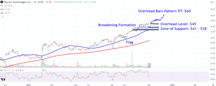 To project an overhead price target above the stock’s ATH, we can use a bars pattern, a chart technique that uses prior price action to predict future moves. In this case, we take Palantir’s trending move from September to October and overlay it from the broadening formation’s lower trendline, which forecasts a target of around $60.