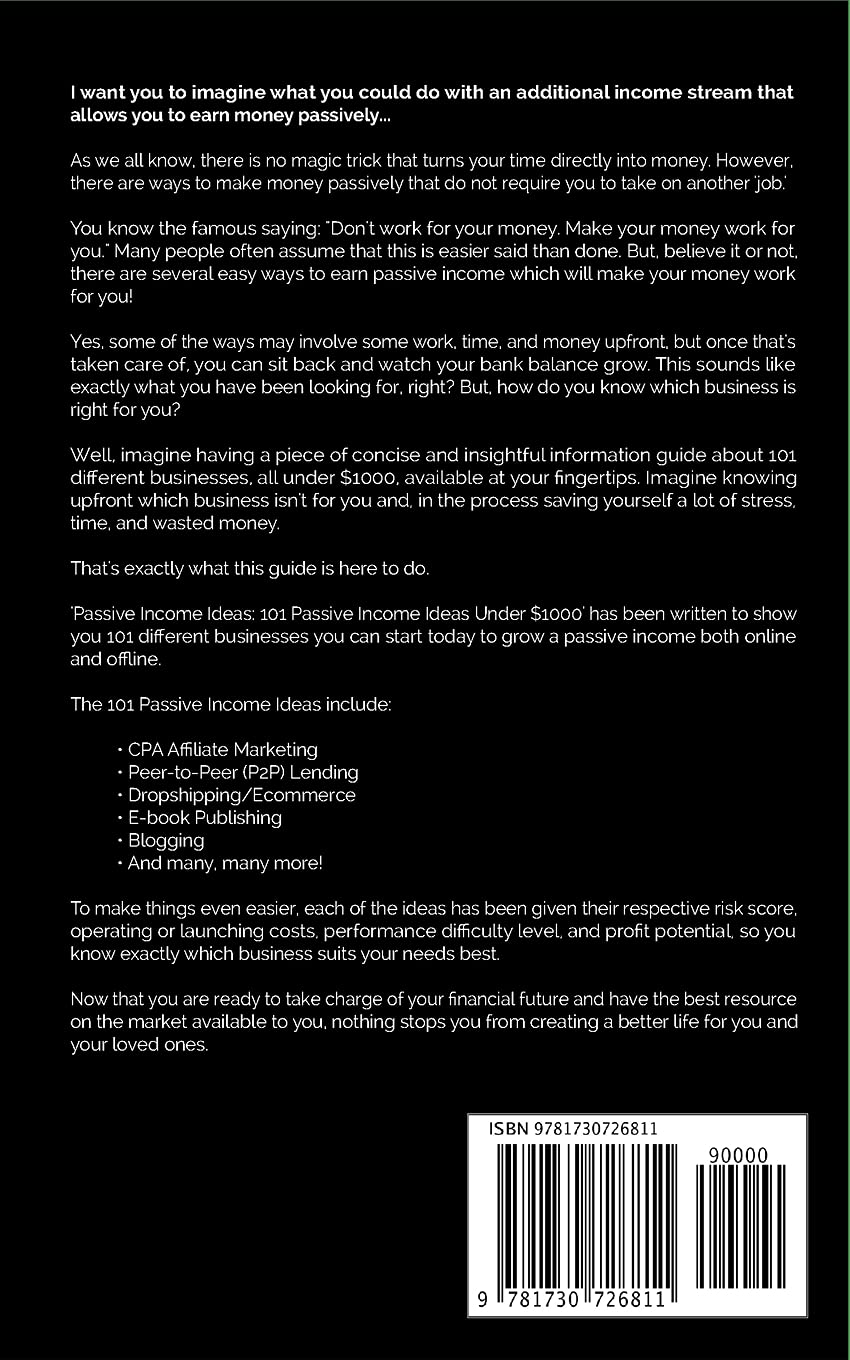 ‘Passive Income Ideas: 101 Passive Income Ideas Under $1000’ has been written to show you 101 different businesses you can start today to grow a passive income both online and offline.