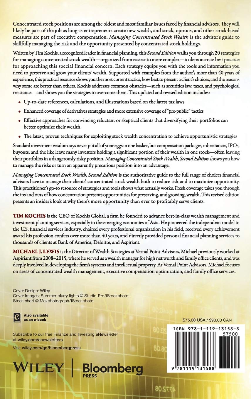 Managing Concentrated Stock Wealth, Second Edition is the adviser’s guide to skillfully managing the risk and opportunity presented by concentrated stock holdings. Written by Tim Kochis, a recognized leader in financial planning, this book walks you through twenty strategies for managing concentrated stock wealth. Each strategy equips you with the tools and information you need to preserve and grow your clients’ wealth. Supported with examples from the author’s forty years of experience, this practical resource shows you the available options, the best order for clients to review those options, and the reasons why some options are better than others. Kochis addresses common obstacles―such as securities law, taxes, and psychological resistance―and shows you the strategies and execution to prevail.