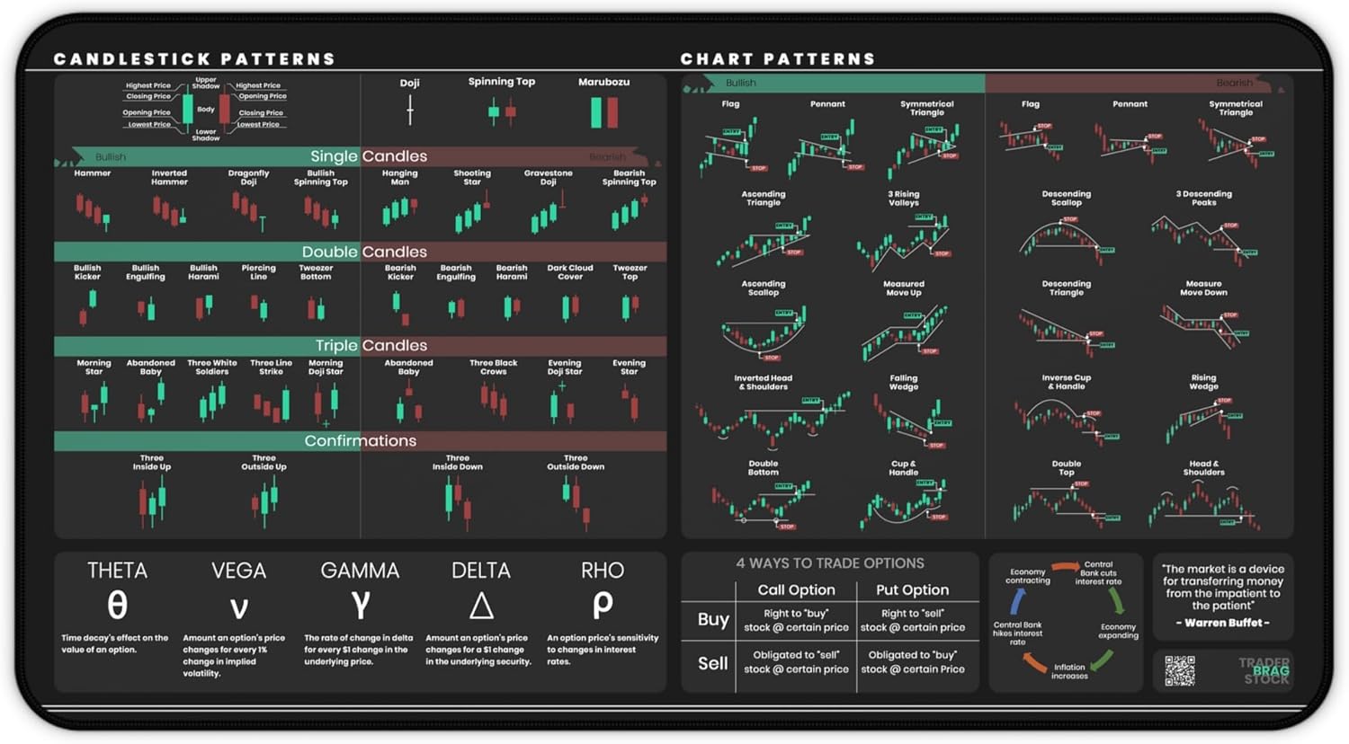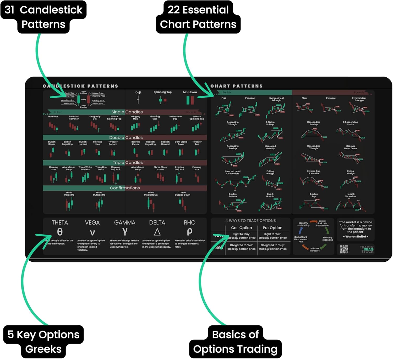 Quick Trading Reference: Features 31 candlestick patterns, 22 chart patterns, and key options trading information for instant guidance during trades.