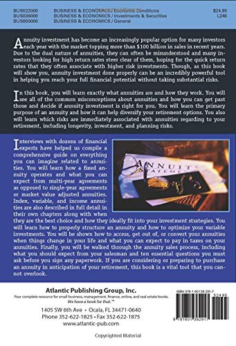 Interviews with dozens of financial experts have helped us compile a comprehensive guide on everything you can imagine related to annuities. You will learn how a fixed annuity operates and what you can expect from multi-year agreements as opposed to single-year agreements or market value adjusted annuities. Index, variable, and income annuities are also described in full detail in their own chapters along with when they are the best choice and how they ideally fit into your investment strategies. You will learn how to properly structure an annuity and how to optimize your variable investments. You will be shown how to access, get out of, or convert your annuities when things change in your life and what you can expect to pay in taxes on your annuities. Finally, you will be walked through the annuity sales process, including what you should expect from your salesman and ten essential questions you must ask before you sign any paperwork. If you are considering or preparing to purchase an annuity in anticipation of your retirement, this book is a vital tool that you cannot overlook.