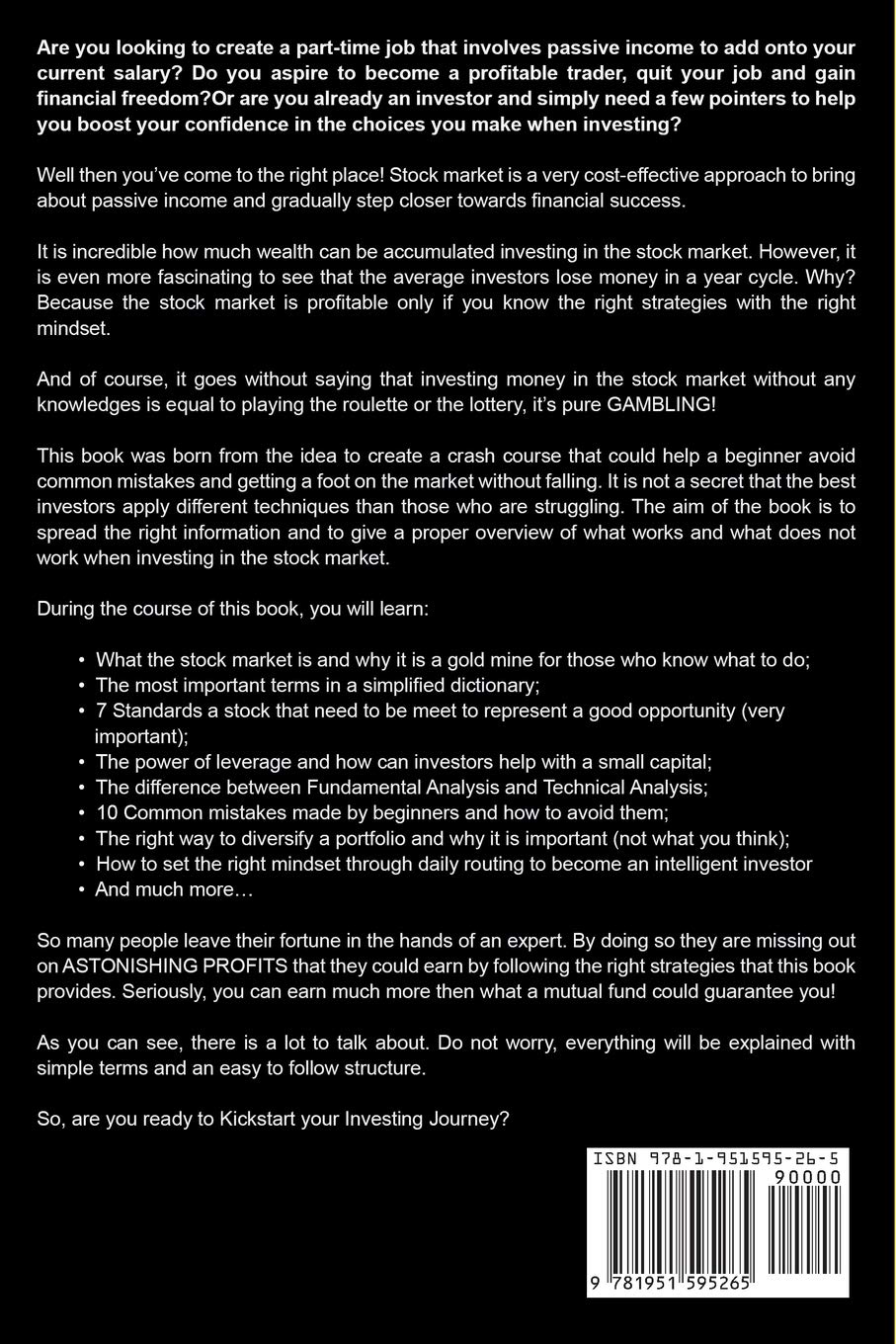 This book was born from the idea to create a crash course that could help a beginner avoid common mistakes and getting a foot on the market without falling. It is not a secret that the best investors apply different techniques than those who are struggling. The aim of the book is to spread the right information and to give a proper overview of what works and what does not work when investing in the stock market.