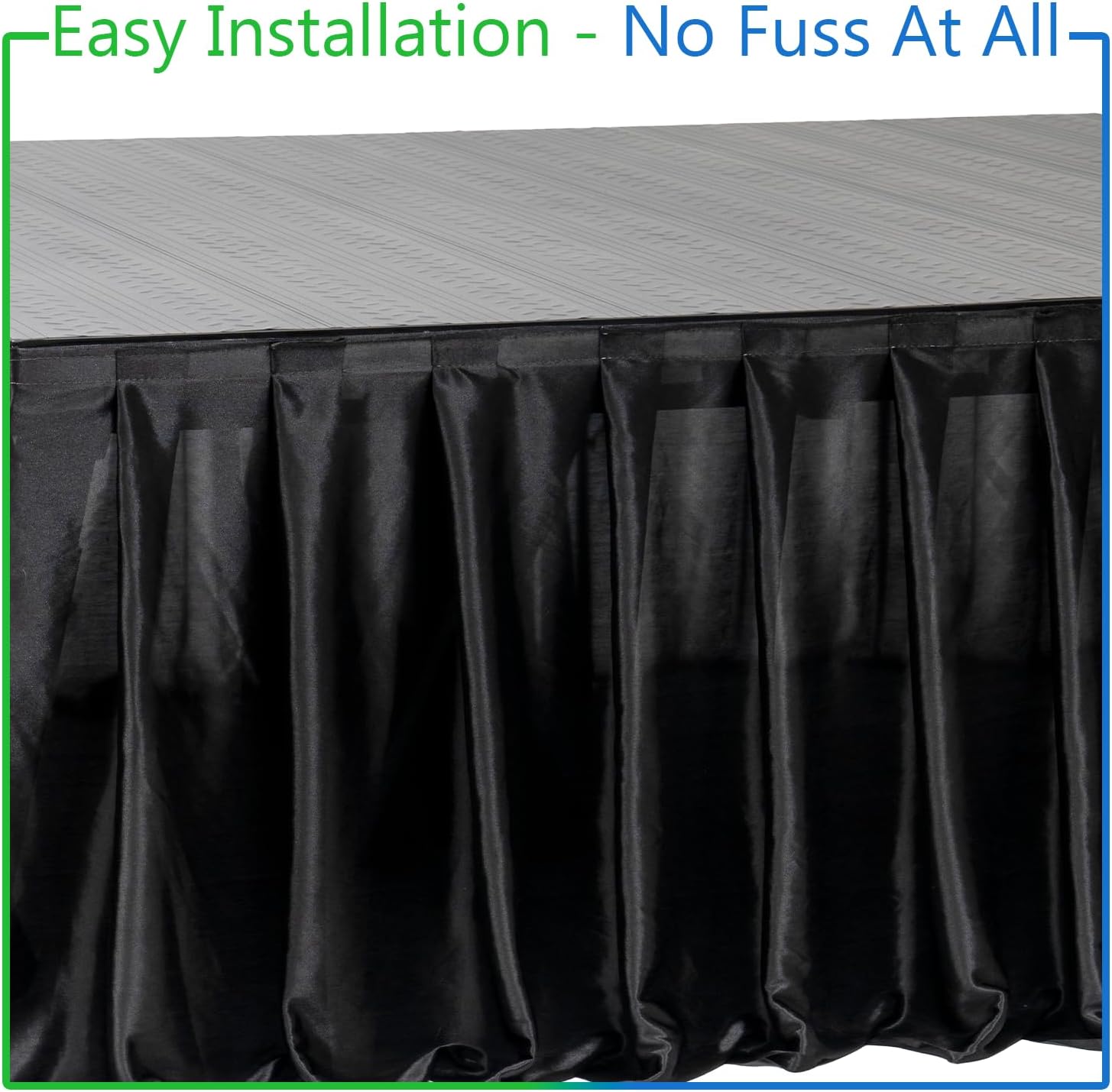 EASY TO USE: Designed to quickly adhere to your Smartstage system, providing coverage and beauty on all sides, comes with adjustable tabs to match the height setting of your stage. Easy to install by simply adhering Tape to the recessed edge of stage platforms. The top of the skirt aligns with the top of the stage surface and remains stiff and vertical with backing material. The skirt for the stage has a built-in Tape loop strip to adhere to the stage edge.