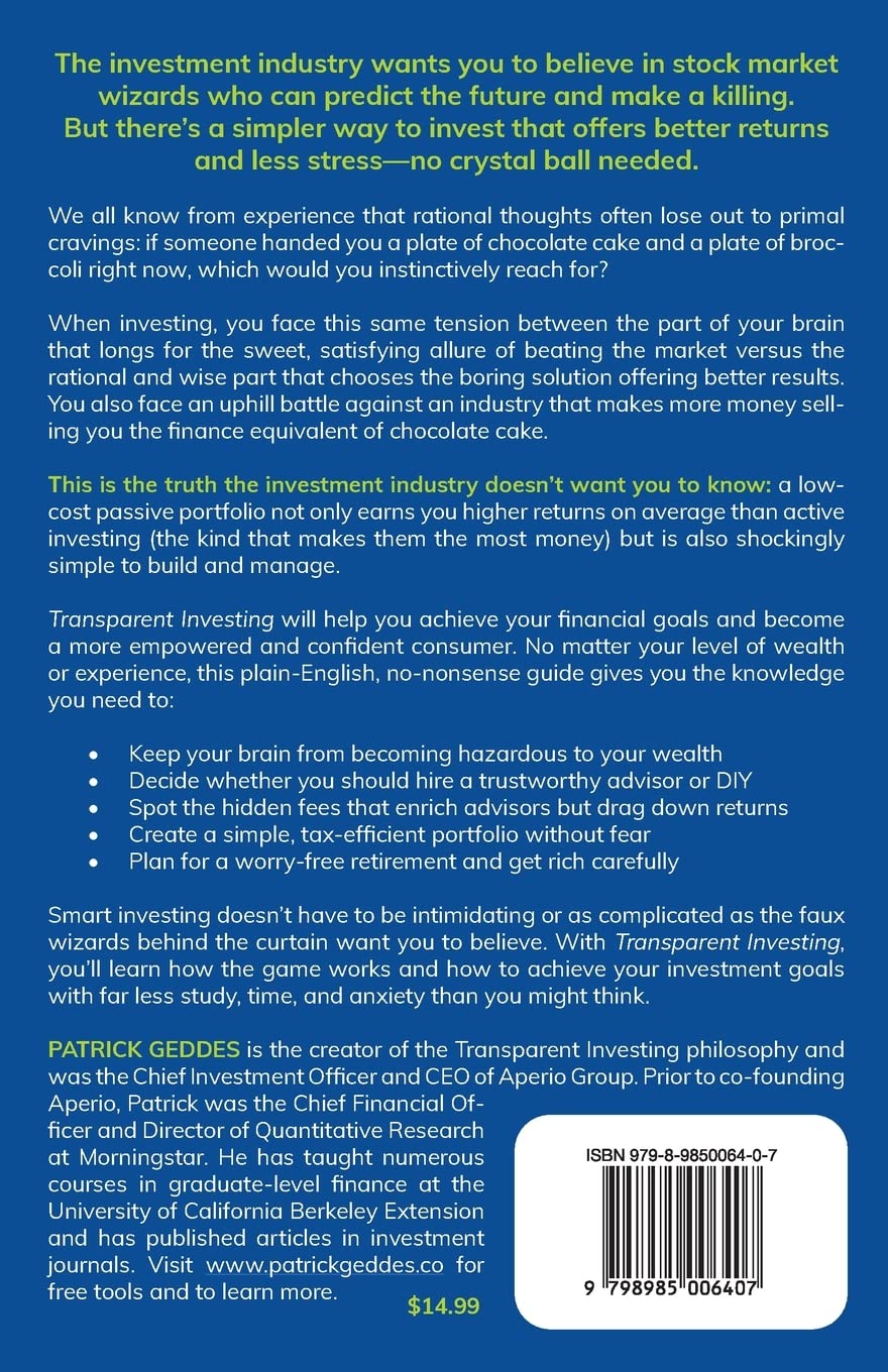 Transparent Investing will help you achieve your financial goals and become a more empowered and confident consumer. No matter your level of wealth or experience, this plain-English, no-nonsense guide gives you the knowledge you need to:Keep your brain from becoming hazardous to your wealthDecide whether you should hire a trustworthy advisor or DIYSpot the hidden fees that enrich advisors but drag down returnsCreate a simple, tax-efficient portfolio without fearPlan for a worry-free retirement and get rich carefullySmart investing doesn’t have to be intimidating or as complicated as the faux wizards behind the curtain want you to believe. With Transparent Investing, you’ll learn how the game works and how to achieve your investment goals with far less study, time, and anxiety than you might think.