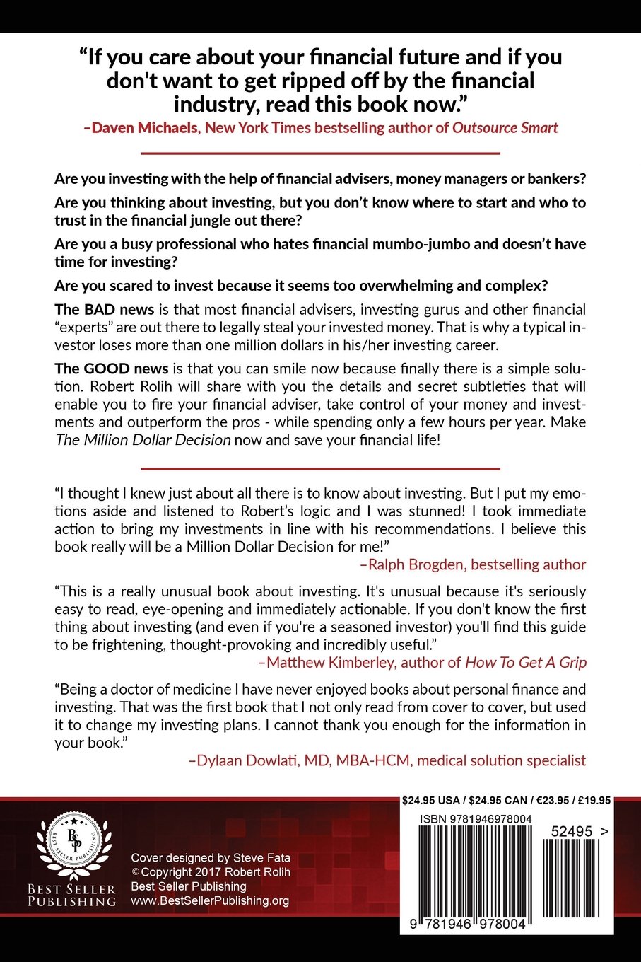 “I thought I knew just about all there is to know about investing. But I put my emotions aside and listened to Robert’s logic and I was stunned! I took immediate action to bring my investments in line with his recommendations. I believe this book really will be a Million Dollar Decision for me!” -Ralph Brogden, bestselling author