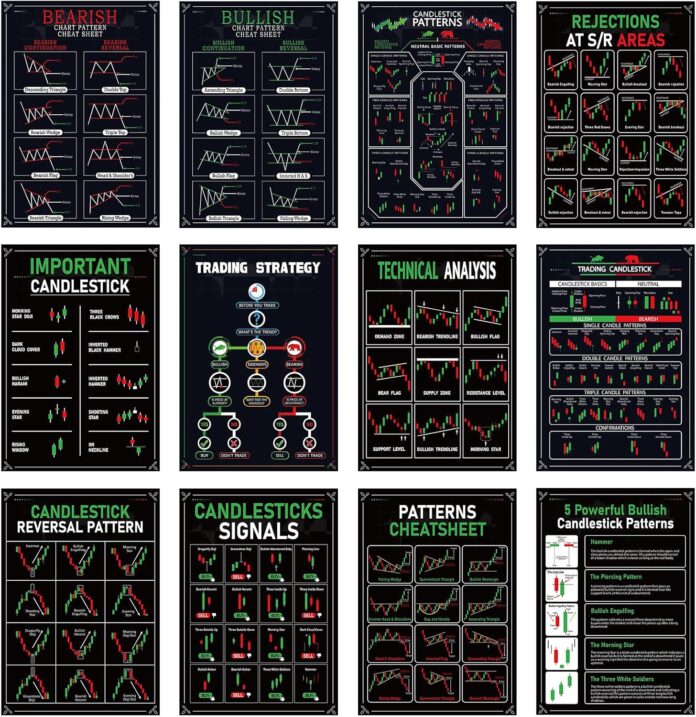 Package includes: This set includes 12 trading chart pattern posters and 100 adhesive dots, providing you with all you need for easy setup. Designed for stock traders, investors, and financial enthusiasts, these candlestick patterns posters serve as a comprehensive trading patterns cheat sheet, making them a must-have for any trading workspace or educational setting.