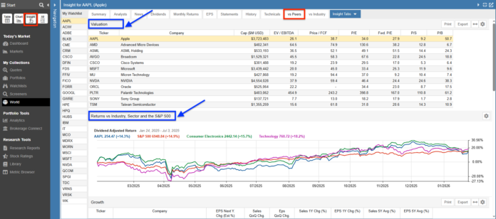 In Stock Rover, you can perform peer comparisons using the ‘vs Peers’ and ‘vs Industry’ tabs in the Insight Panel. These views allow you to compare a specific stock directly against its industry peers across metrics like valuation, growth, and returns.